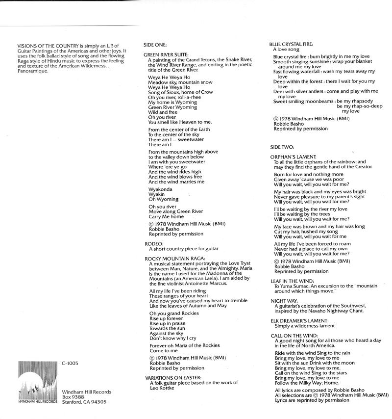 Tako pravi Robbie Basho, toda njemu je uspelo na plo??i Visions of the Country, da du?a in tehnika delata kot eno.
