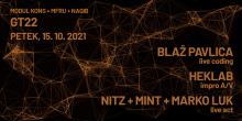 Večer bodo z live actom zazankali Nitz, MINt in Lük, trije izkušeni jezdeci elektronskih (sub)žanrov. Tine Vrabič, Gregor Jaklin in Marko Lük v tokratnem skupnem performansu startajo v žanrih deep techna in electra, hipnotične perkusije, večplastne atmosfere, globoke baslinije in mestoma razsekano ritmično strukturo, ki se bodo na Intimnem odru GT22 prepletali po kablih iz analognih in digitalnih hardware mašin, pa boste lahko v ušesa ujeli tudi v prenosu na 95,9 MHz.